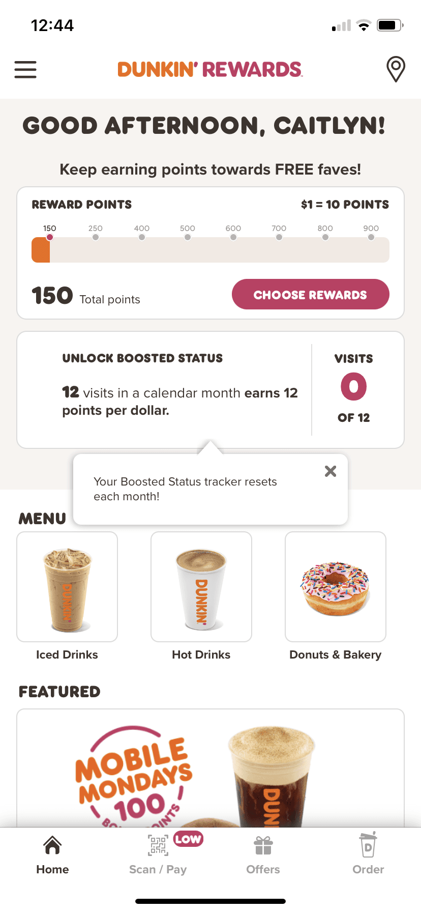Dashboard with rewards and quick actions
