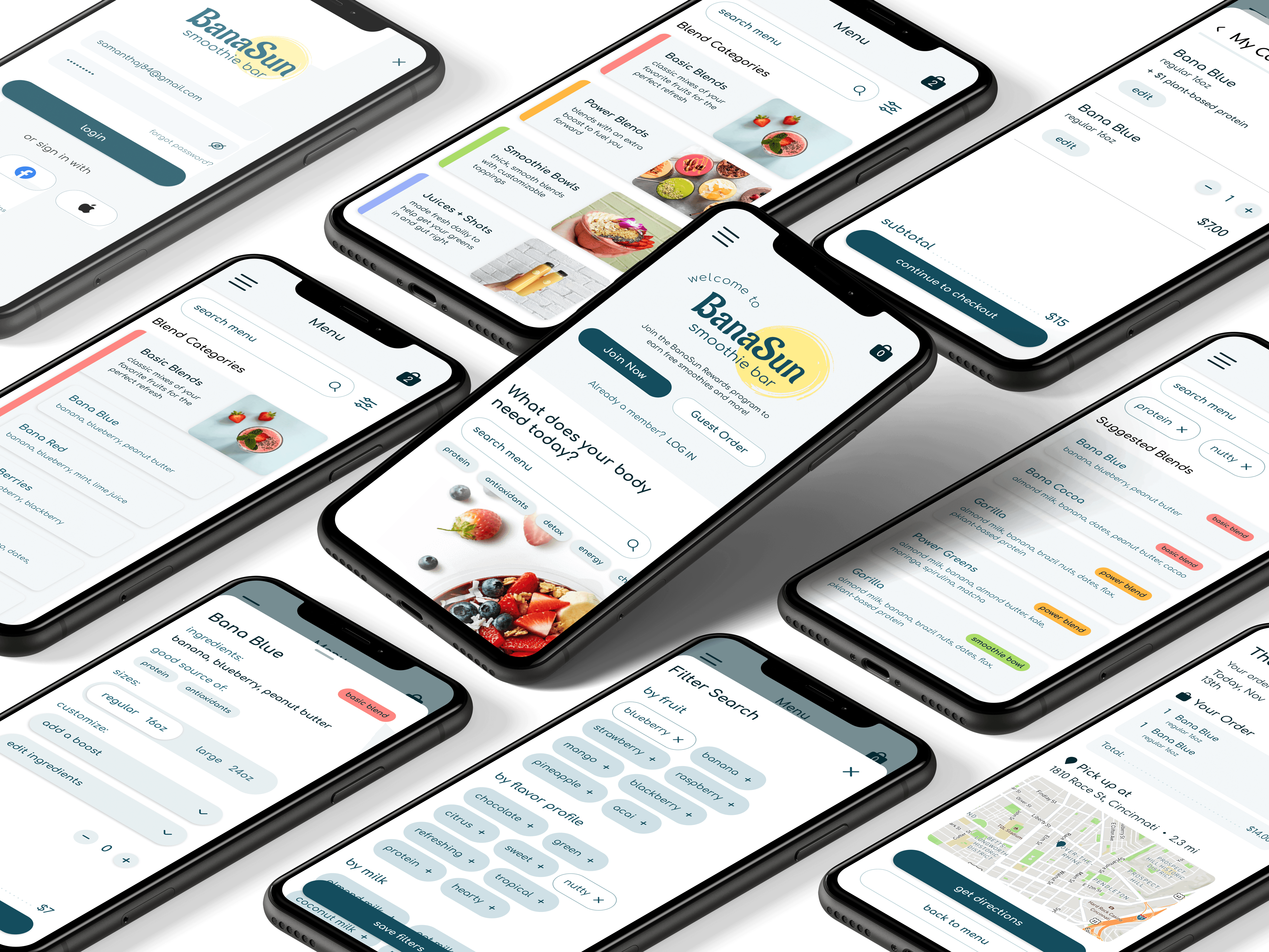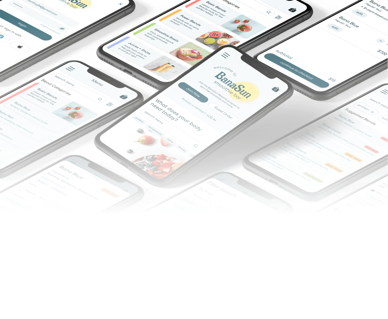 Build a mobile ordering platform that will combine efficiency and convenience with a connection to a business rooted in the local community. With a fresh and fruity design style, the BanaSun app will allow customers to customize smoothie orders, order ahead to avoid long lines in peak seasons and track their reward points.